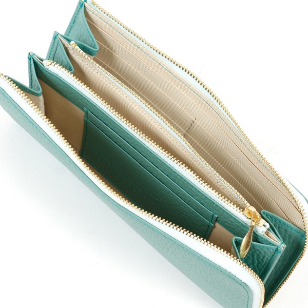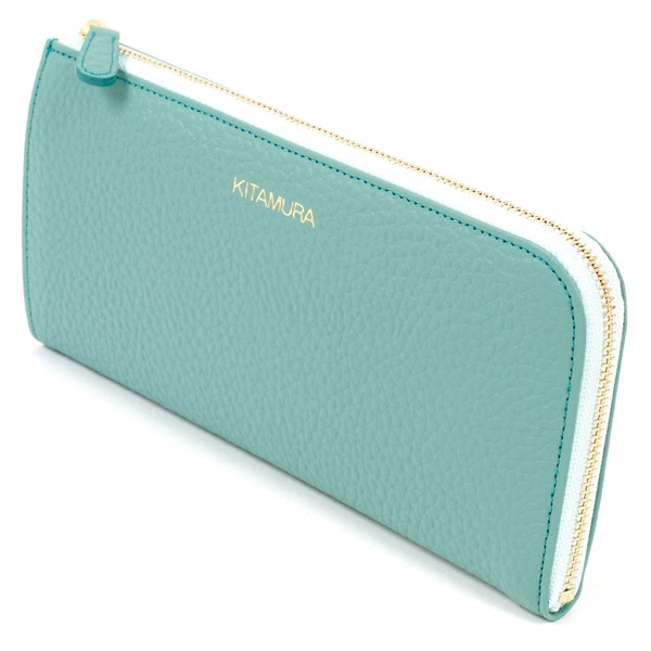 本体とファスナーテープのカラーコンビがポイントの長財布。カラーコンビが映えるシンプルなデザインで、前面には箔押しのKITAMURAロゴをあしらいました。たくさん入れてもすっきり持てるL字ファスナータイプ。内装はカード段が充実しており、出し入れもスムーズです。