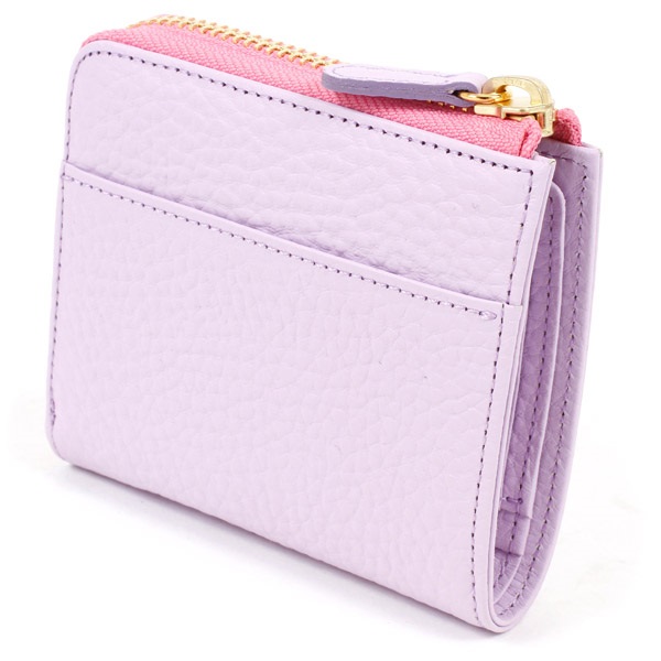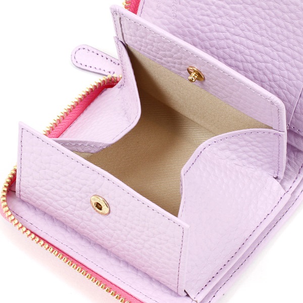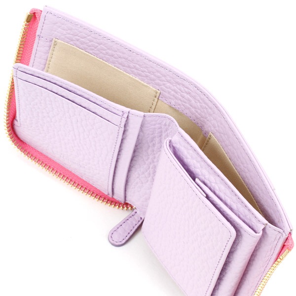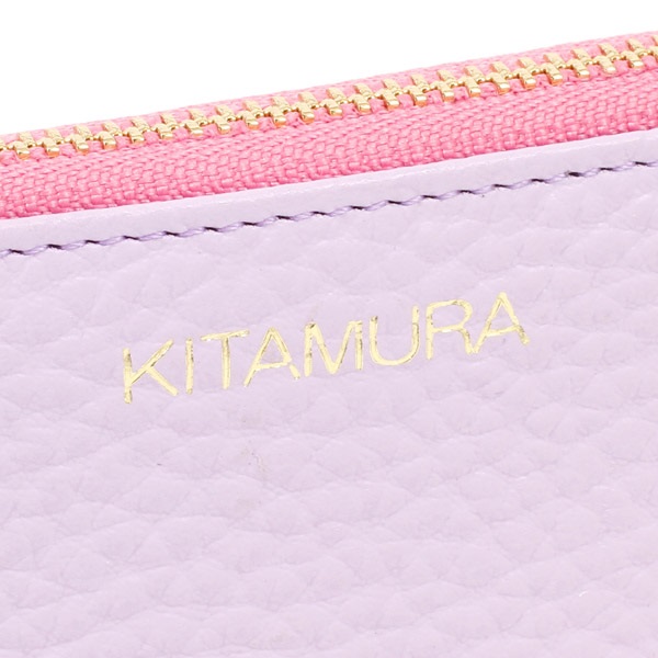 本体とファスナーテープのカラーコンビがポイントの二折財布。カラーコンビが映えるシンプルなデザインで、前面には箔押しのKITAMURAロゴをあしらいました。最低限のカードと、お札、小銭が入るコンパクトなサイズ感で、ミニバッグでのお出かけにもおすすめ。開閉はL字ファスナーで、小銭入れは中身が見やすく取り出しやすいボックスタイプです。