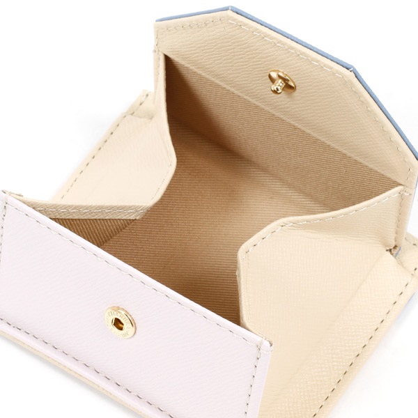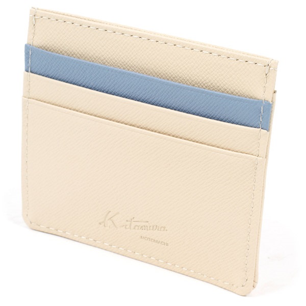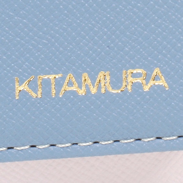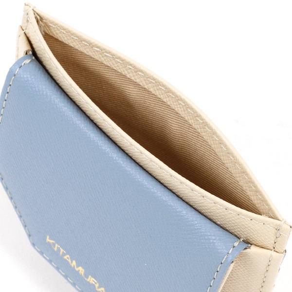 3色のマルチカラーがポイントの小銭入れ。かぶせに箔押しのKITAMURAロゴをあしらいました。お札を半分に畳めば中央のポケットに収納でき、コンパクトなお財布としてもおすすめ。素材にはキズが目立ちにくい型押しの牛革を使用しています。