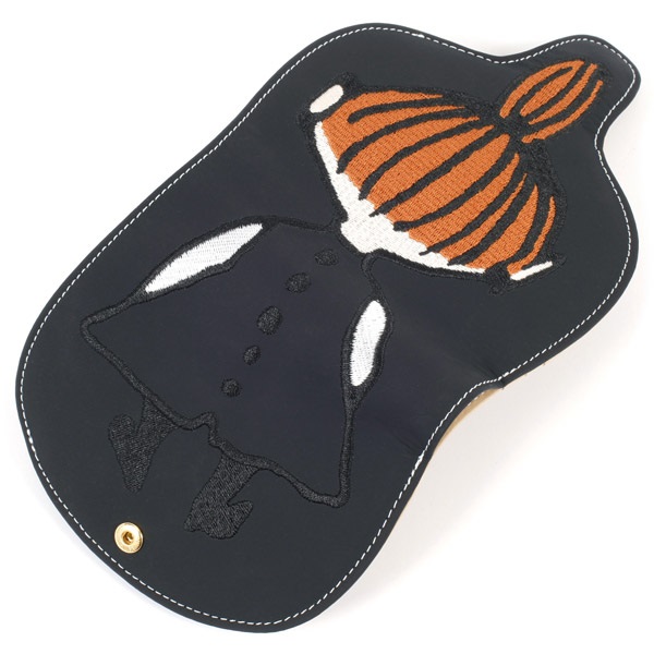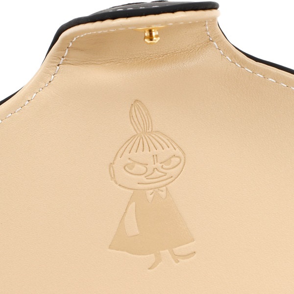 リトルミイの後ろ姿を刺繍で大胆にあしらった二折財布。特徴的なタマネギ型のおだんご頭を、お財布のホック部分のシルエットに見立てました。まるでリトルミイがでんぐり返ししているようなユーモアのあるデザイン。小銭入れは立体的に開くボックスタイプで機能的です。内装にはリトルミイの全身像を素押しであしらいました。