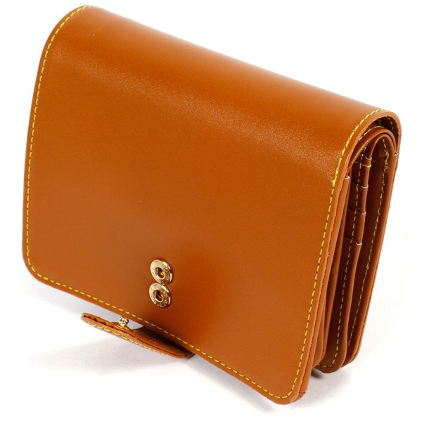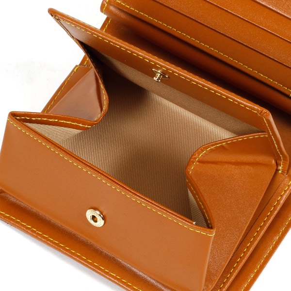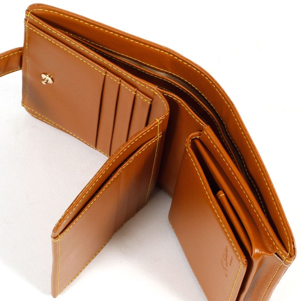 上品なツヤ感のあるスムース牛革を使用した二折財布。発色が美しい本体カラーと抜きのKマークとのカラーコンビがアクセントになっています。小銭入れはボックスタイプでカードポケットも多く収納力に優れています。