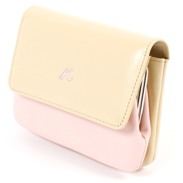 袋縫いの仕立てが優しい印象の二折財布。ふっくらとした触り心地で、がま口の小銭入れを包み込むようなかぶせが特徴です。カード類やたたんだお札は内ポケットに収納可能。かぶせ裏にもポケットが付いており、レシート、クーポンなどを分けて収納できます。かぶせのKマーク刺繍がワンポイント。カラーコンビが可愛らしく、バリエーション豊富で選ぶ楽しさが広がります。