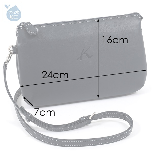 撥水加工を施したウォータープルーフ牛革のショルダーバッグ。裏地にも撥水のワックス加工を施しており、雨の日も気兼ねなくお使いいただけます。内装は2層に分かれており、小ぶりながら長財布が収納できるサイズ感。前面にあしらったさり気ないKマーク素押しがワンポイントです。
