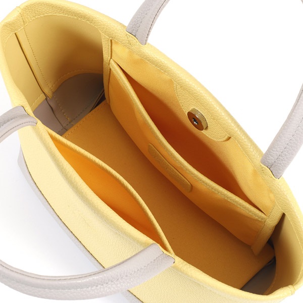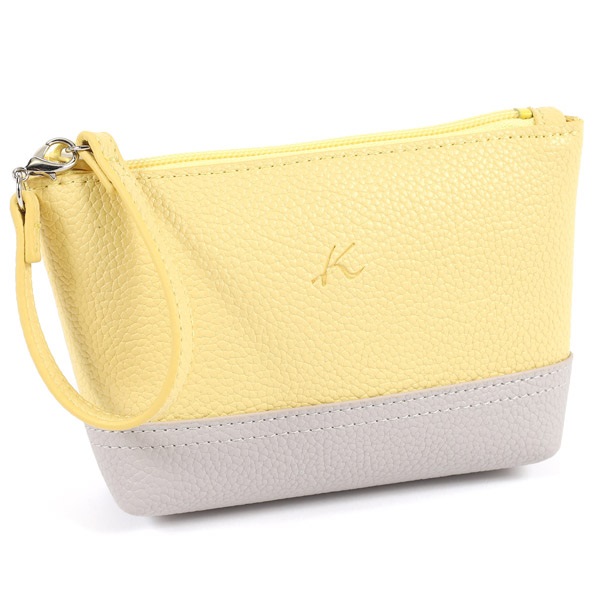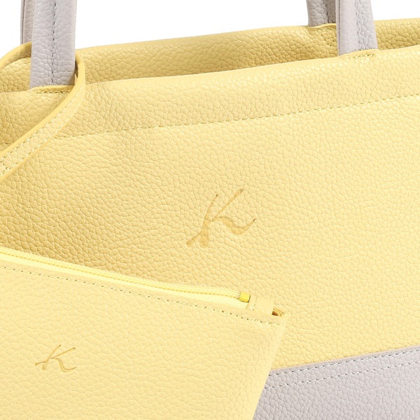 カラーコンビがアクセントのハンドバッグ。同デザインのポーチが付属し、取り外しも可能です。小ぶりですが長財布や折りたたみ傘をゆったり収納できるサイズ感で、内装には細かい物の収納に便利なポケット付き。前側にさり気なくKマーク素押しをあしらいました。合皮素材なので、雨の日も気兼ねなくお使いいただけます。