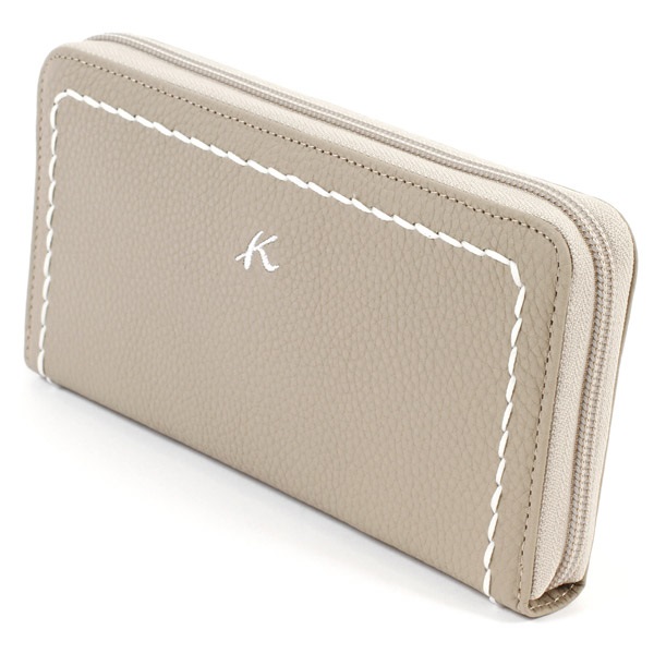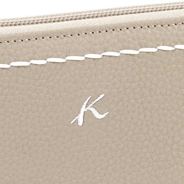 シボ感となめらかな手触りが特徴のシュリンクレザーを使用したラウンド型長財布。目の大きいステッチの縁取りと、刺繍のKマークがアクセントになっています。内側のポケットは3層に分かれており、カードポケットも豊富で収納力抜群。機能性にもこだわりました。