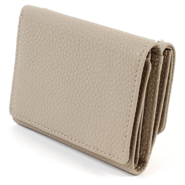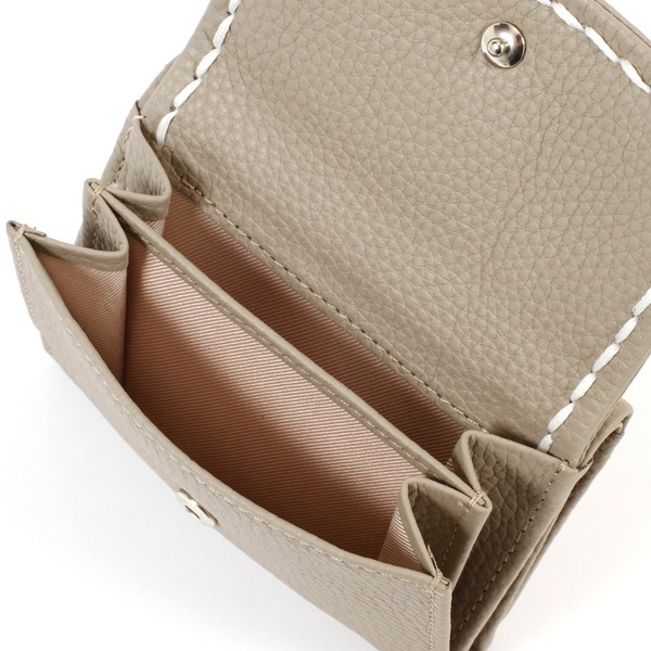 シボ感となめらかな手触りが特徴のシュリンクレザーを使用した三折財布。目の大きいステッチの縁取りと、刺繍のKマークがアクセントになっています。手のひらに収まるコンパクトなサイズ感で、お札も折らずに持ち運べます。