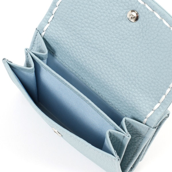 シボ感となめらかな手触りが特徴のシュリンクレザーを使用した三折財布。目の大きいステッチの縁取りと、刺繍のKマークがアクセントになっています。手のひらに収まるコンパクトなサイズ感で、お札も折らずに持ち運べます。