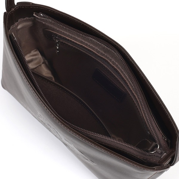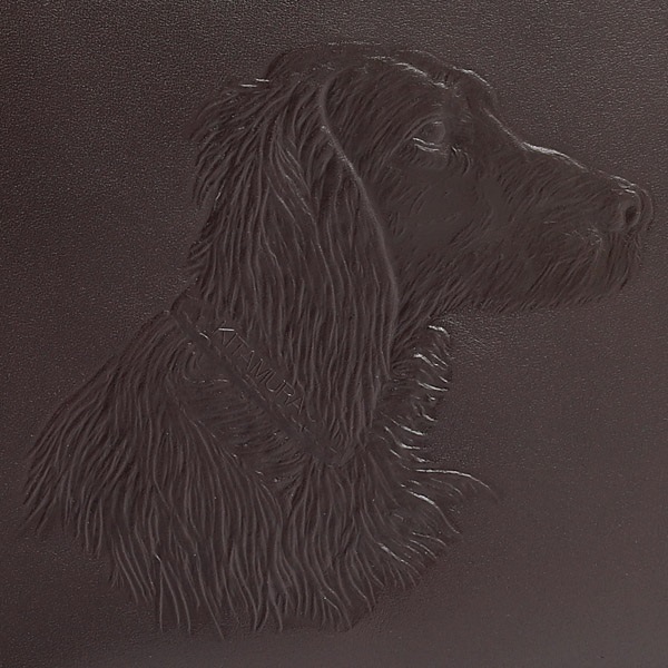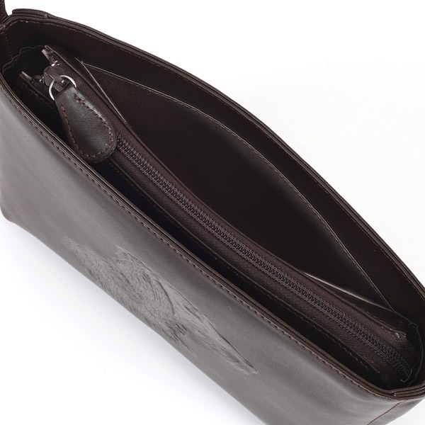 クラシックな雰囲気が上品な牛革のショルダーバッグ。キタムラのショッパーにも描かれている、アイリッシュ・セターの横顔が印象的なデザインで、やわらかな毛並みや、首輪の「KITAMURA」も素押しでしっかりと表現。細部にまでこだわりが詰まっています。口元はファスナー仕様ですが、両脇がオープンポケットになっており、ハンカチやスマホなどすぐに取り出したい小物の収納に便利です。