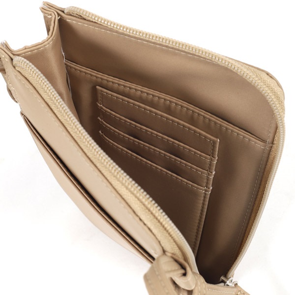 収納スペースが充実したコンパクトなスマホショルダーバッグ。軽量でハリ感のあるナイロン素材を使用しています。口元はL字ファスナーで出し入れしやすく、ポケットは外側に2つ、内側はポケット2つとカード段が付いています。スマホ以外にもパスポートやカードも収納でき、普段使いはもちろん、トラベルシーンにもおすすめです。