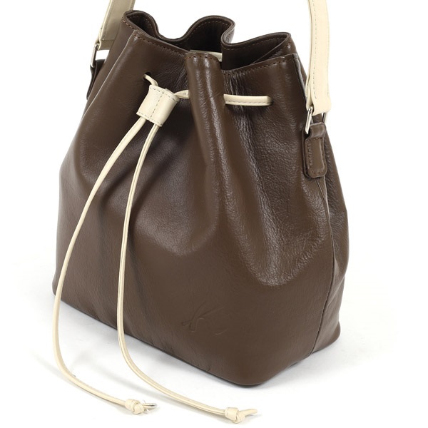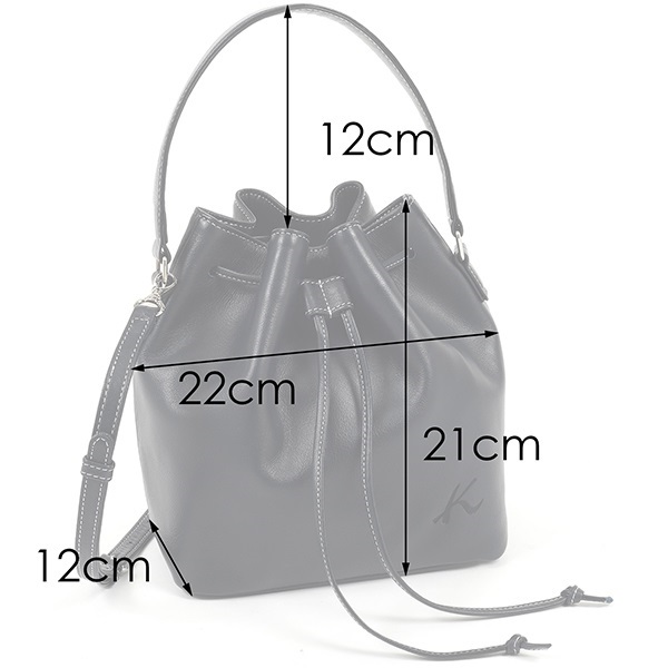 やわらかな革の特性を活かした巾着風デザインの2wayハンドバッグ。着脱できるショルダーベルトが付属し、肩掛けでもお使いいただけます。280gと軽量なのも嬉しいポイント。前面の右下に、さり気なく素押しのKマークをあしらいました。