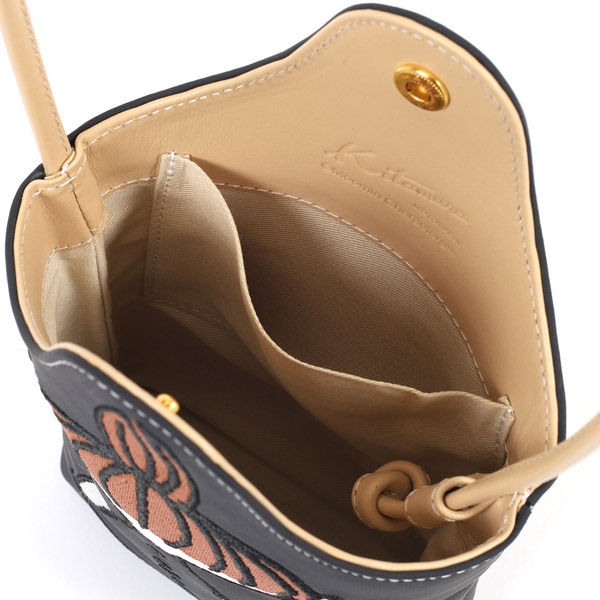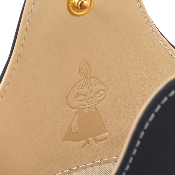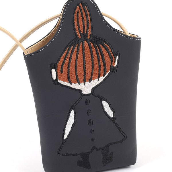 リトルミイの後ろ姿を刺繍で大胆にあしらったショルダーバッグ。特徴的なおだんご頭のシルエットをいかしたフォルムに仕上げました。内装には、さり気なくリトルミイの全身像が素押しで入っています。バッグの裏面には外ポケットが付いており、パスケースやハンカチなど、サッと取り出したい小物の収納に便利。ショルダー紐は中の結び目で調整できます。お揃いの二折財布(PH0826)が収納可能なサイズです。