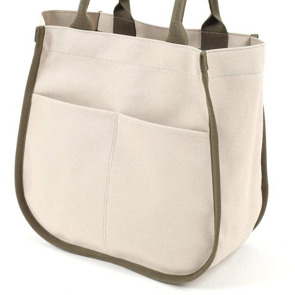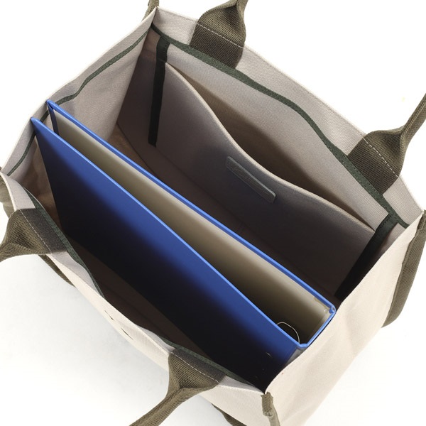 A4バインダーが縦に入るシンプルなトートバッグ。背面の外ポケットは、スマホや鍵などすぐ取り出したいものの収納に便利です。マチがしっかりあり、収納力も抜群。キャンバス素材で軽く、デイリーに気軽にお使いいただけます。