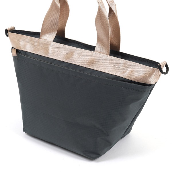 弱撥水のポリエステル生地を使用した2wayハンドバッグ。着脱可能なショルダーベルトが付属し、斜め掛けもできます。持ち手カラーと同色のKマーク刺繍がワンポイント。長財布や折りたたみ傘がゆったり入るサイズ感で、デイリー使いにぴったりです。非常に軽量なのも嬉しいポイント。背面側には外ポケットが付いています。