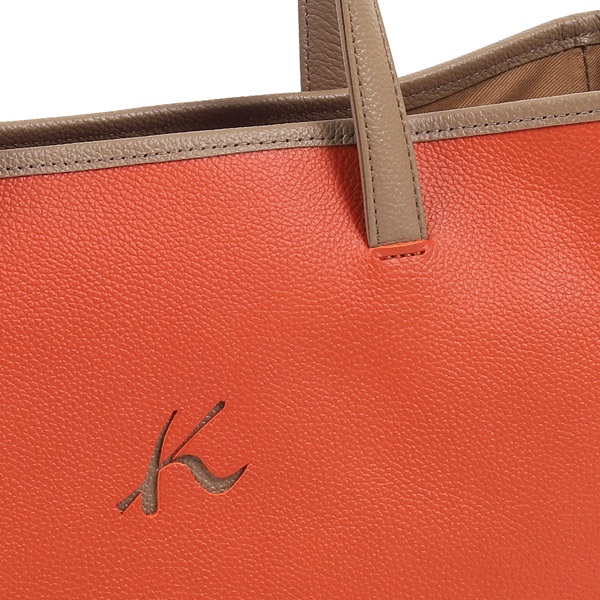 Kマークがワンポイントのシンプルなハンドバッグ。本体と持ち手のカラーコンビがアクセントです。型押しシュリンクを使用しており、キズが目立ちにくいのも嬉しいポイント。内ポケットも充実しており、デイリー使いにおすすめです。