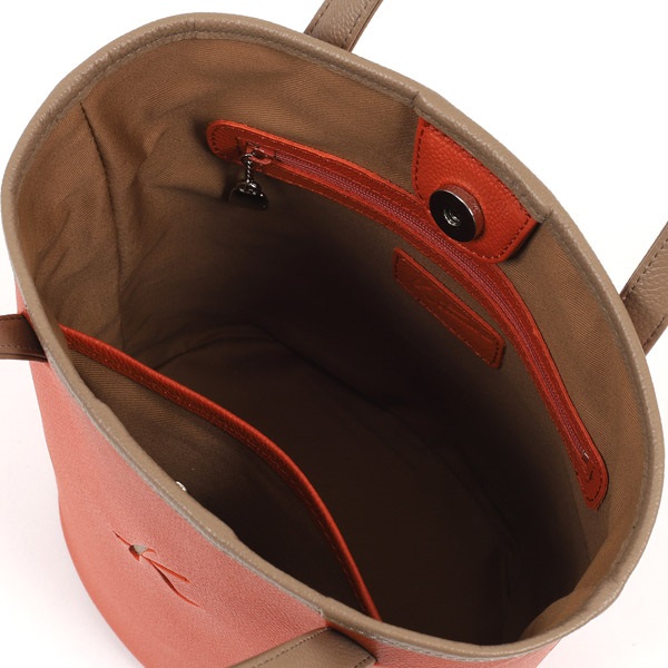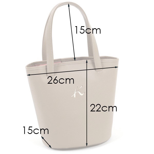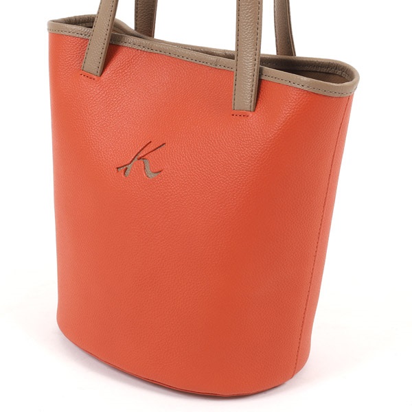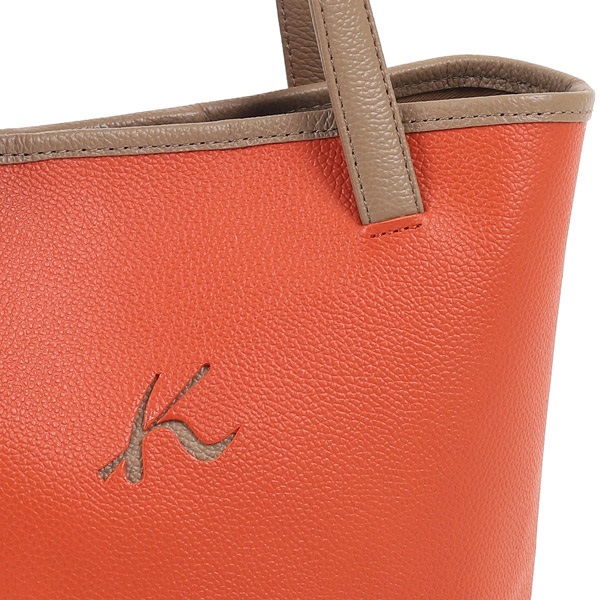 Kマークがワンポイントのハンドバッグ。本体と持ち手のカラーコンビがアクセントです。型押しシュリンクを使用しており、キズが目立ちにくいのも嬉しいポイント。小ぶりなサイズ感ですが、マチがあるので収納力もあります。