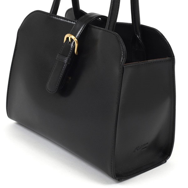 バックルベルトがポイントのハンドバッグ。ツヤのある牛革を使用し、クラシカルで上品な印象に仕上げました。マチが広く、長財布やポーチもゆったり入ります。バックルベルトはマグネット付きで開閉もスマート。サイドのマチにさり気なくKitamuraロゴの素押しが入っています。きちんと感のあるスクエアフォルムで、オケージョンスタイルにもおすすめです。