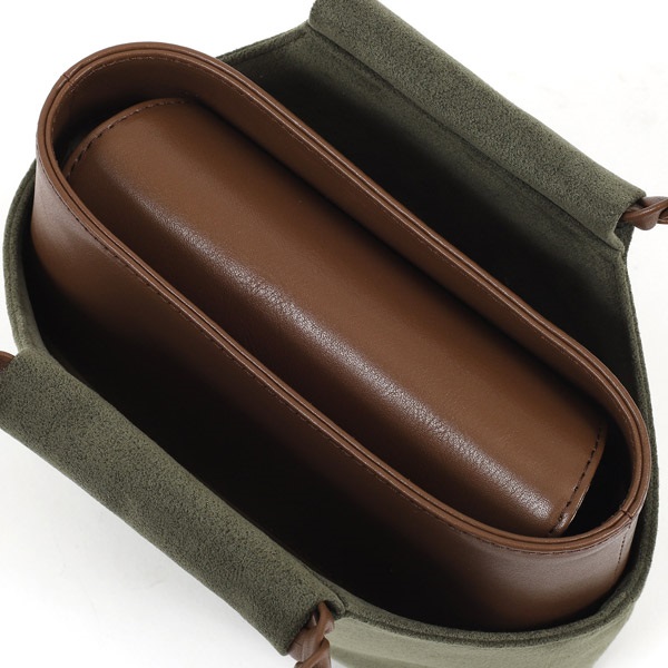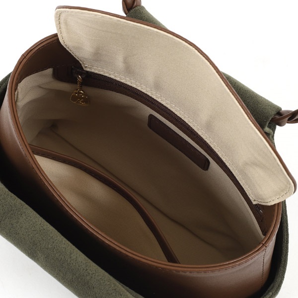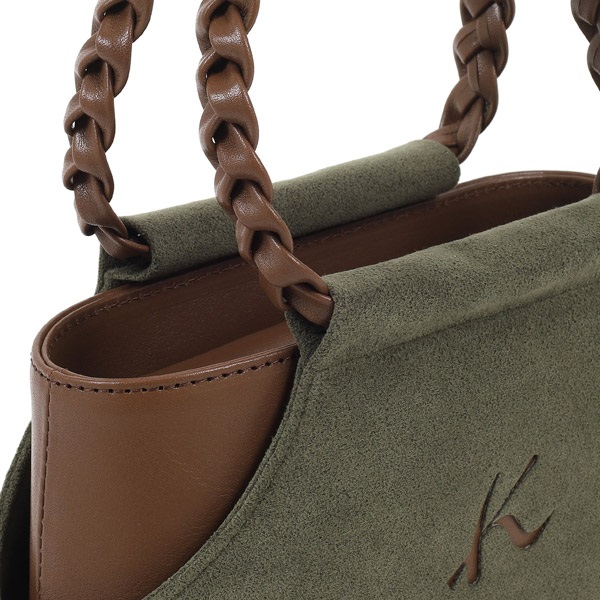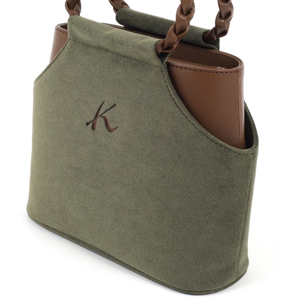 サイドをカットしたレイヤードデザインが印象的なハンドバッグ。編み込みの持ち手が可愛らしさをプラスします。配色カラーのKマークがワンポイント。カラーにより素材が異なり、カーキとチョコにはヌバック調の合皮を使用しています。カジュアルにもきれいめにも合わせやすく、コーディネートの幅が広がります。
