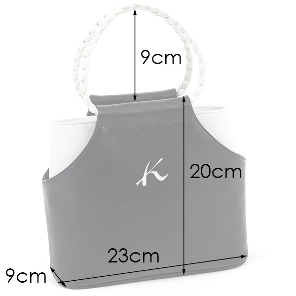 サイドをカットしたレイヤードデザインが印象的なハンドバッグ。編み込みの持ち手が可愛らしさをプラスします。配色カラーのKマークがワンポイント。カラーにより素材が異なり、カーキとチョコにはヌバック調の合皮を使用しています。カジュアルにもきれいめにも合わせやすく、コーディネートの幅が広がります。