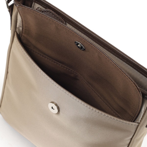 牛革×ナイロンコンビのショルダーバッグ。カジュアルなナイロン素材に、牛革が洗練された上品さをプラスしています。ナイロンをメイン素材にすることで、軽い仕上がり。長時間の使用でも肩が疲れにくいため、アクティブなお出かけにぴったりです。裏面の外ポケットは、スマホやパスケースなど、必要な時にすぐに取り出したい小物の収納に便利です。