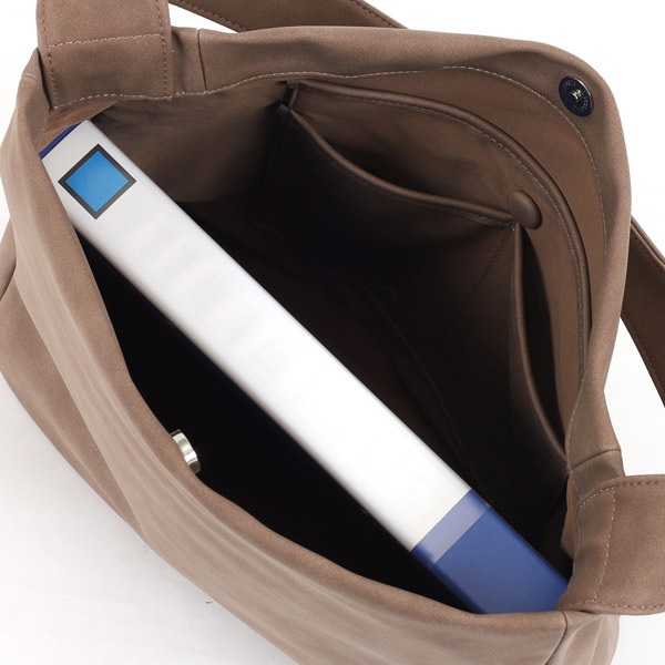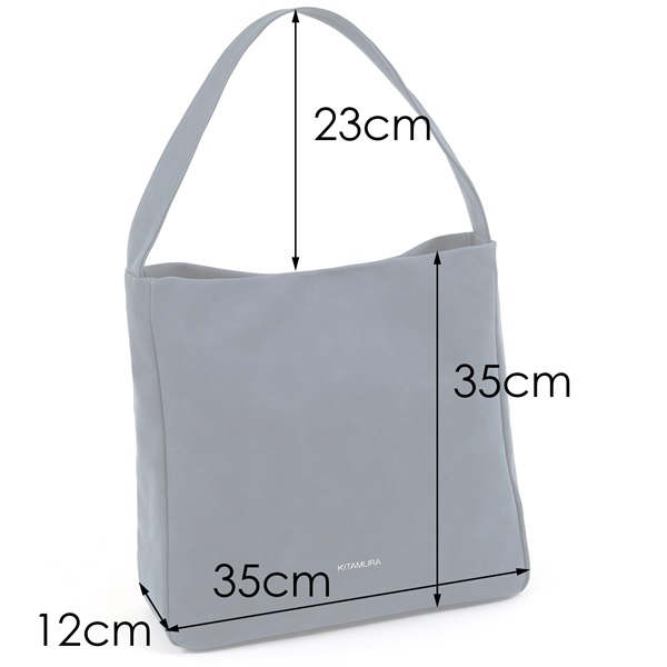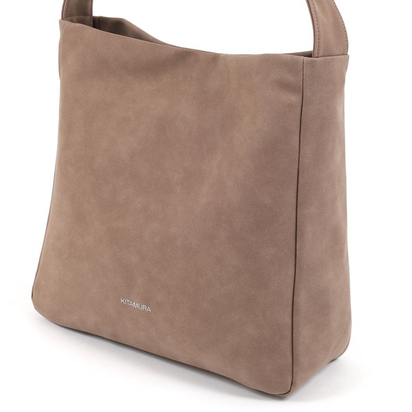 季節感が楽しめる合皮スエードを使用したセミショルダーバッグ。素材感をいかした、ざっくりと持てるシンプルなデザインに仕上げました。前側にあしらったKITAMURAロゴがワンポイント。持ち手が長めのつくりで、厚手のお洋服の際もスムーズに肩掛けできます。A4サイズ対応で通勤通学にもおすすめです。