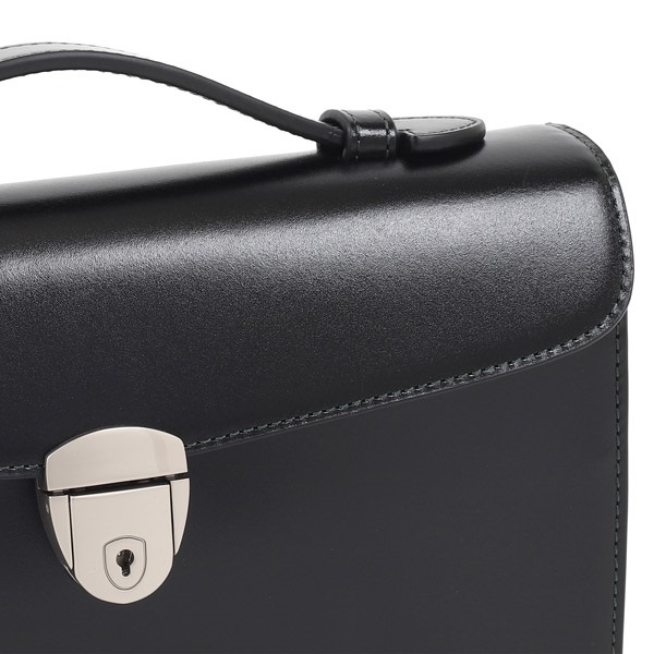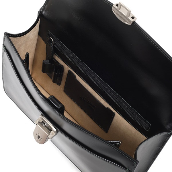 上質なヌメ革を使用した錠前付きセカンドバッグ。従来のセカンドバッグよりコンパクトで、小脇に抱えてもしっくりと馴染むサイズ感になっています。マット(艶なし)仕上げの金具が過度に主張せず、落ち着いた印象で上品さと高級感を演出。デイリーからフォーマルシーンまで、幅広くお使いいただけます。