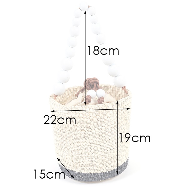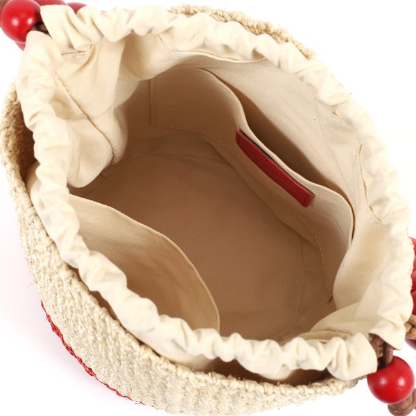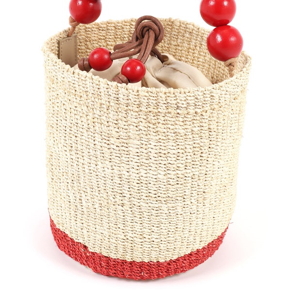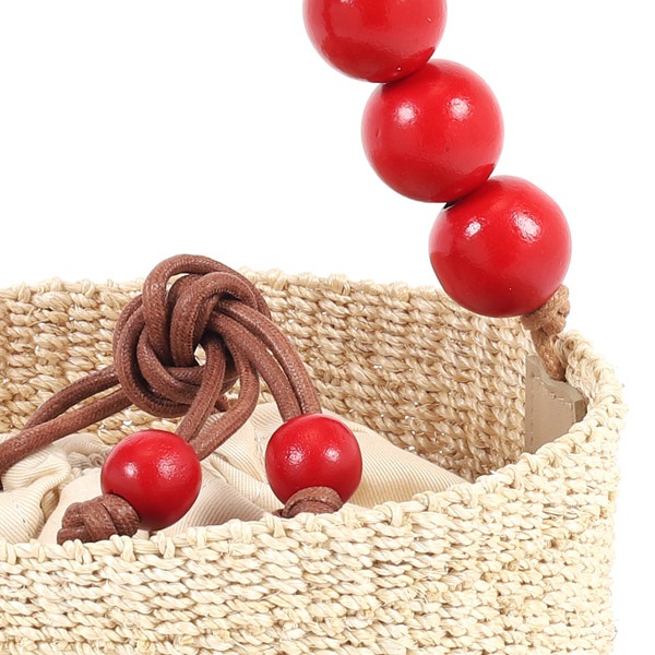 木玉を連ねた持ち手のデザインが印象的なハンドバッグ。軽量で耐久性が高く、環境に優しい天然草木のアバカを使用しています。涼しげでナチュラルな風合いがコーディネートに季節感をプラス。インナーバッグとなる付属の巾着は取り外し可能で、巾着紐にも木玉をあしらっています。