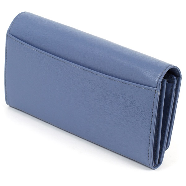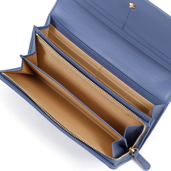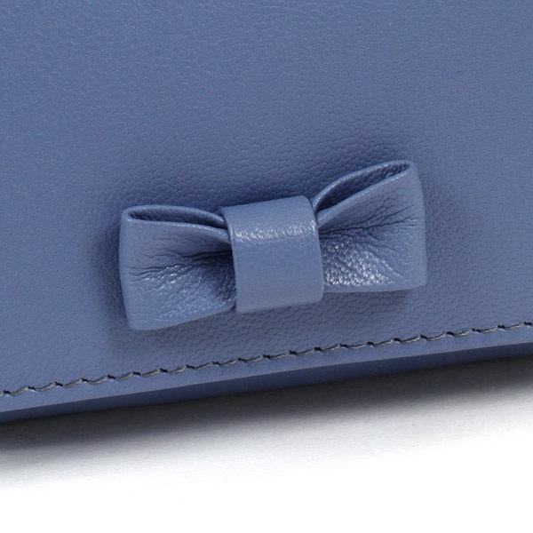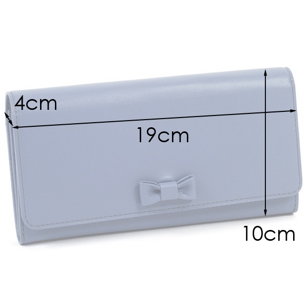 かぶせにあしらわれたプチリボンがワンポイントのシンプルな長財布。丈夫で手触りのよい山羊革を使用しています。明るいカラー展開も魅力。豊富なカード段のほか、背面ポケットや小銭入れ部分の仕切り等、収納力と機能性も兼ね備えています。