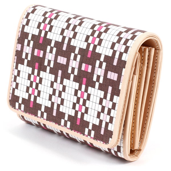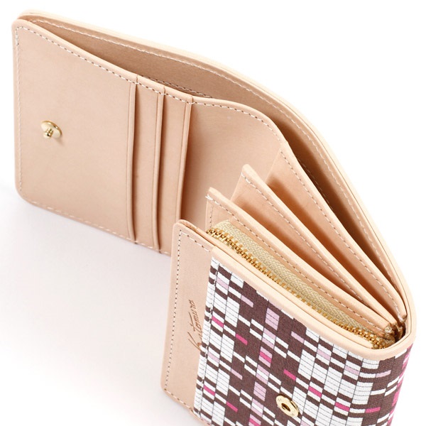 細やかなメッシュ風プリントのキャンバス生地を使用した二折財布。縁取りや内装にはヌメ革を使用しており、使うほどに色の深みが増していく経年変化が楽しめます。小ぶりながら、カード段や内ポケットなど収納スペースが充実。小銭入れは大きく開いて見やすいL字ファスナータイプです。