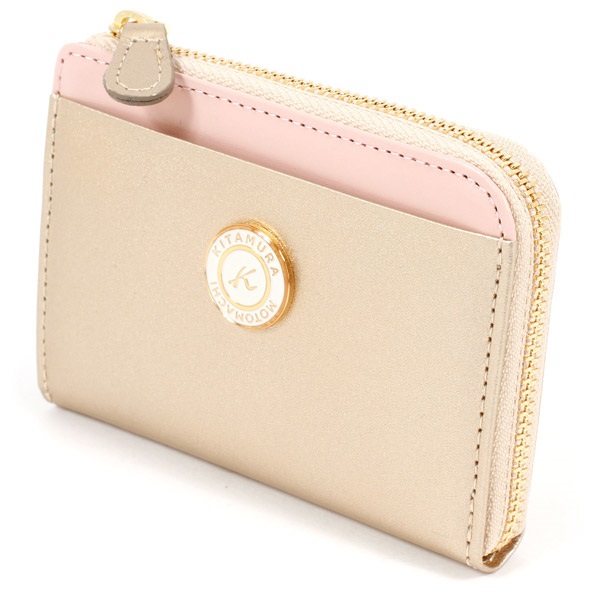 ツヤとハリのある牛革でお作りした小銭入れ。表面の一部にアクセントカラーをプラスしました。L字ファスナーのすっきりとしたフォルムが上品な印象です。「KITAMURA MOTOMACHI」の文字に囲まれたKマークの飾りがポイント。カードも収納でき、コンパクトなお財布としてもおすすめです。