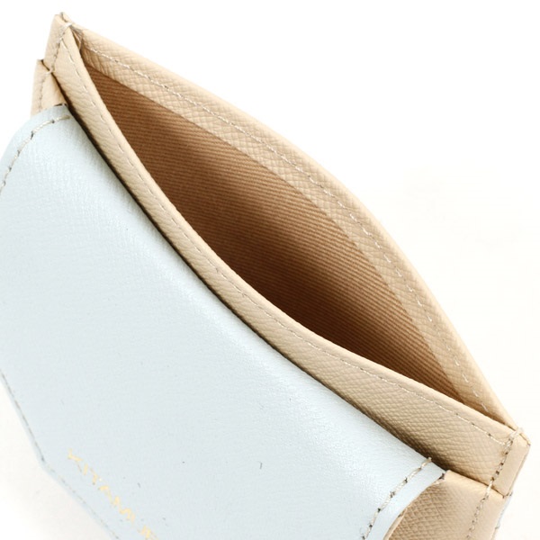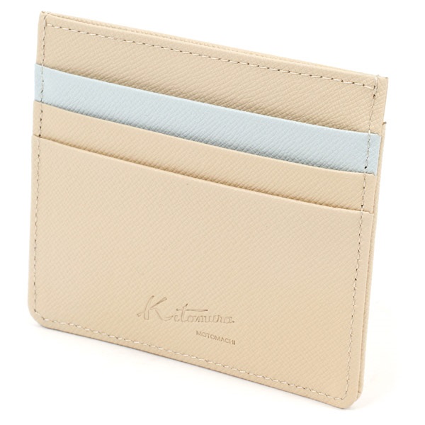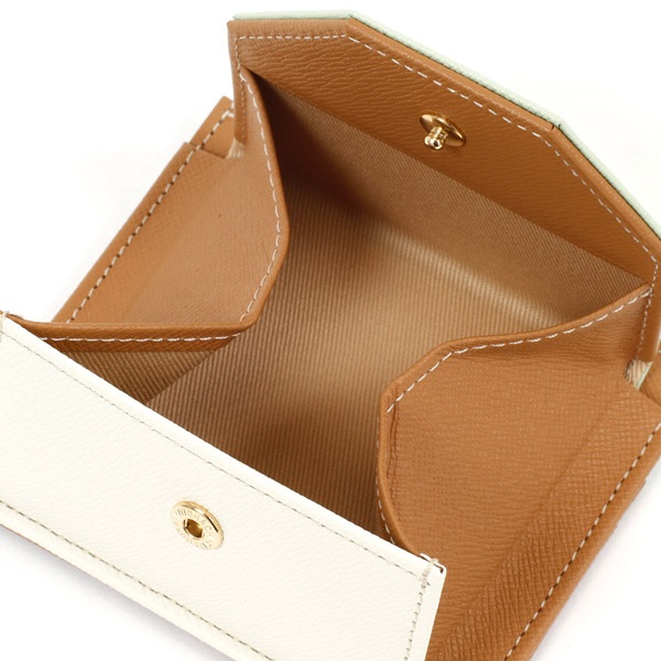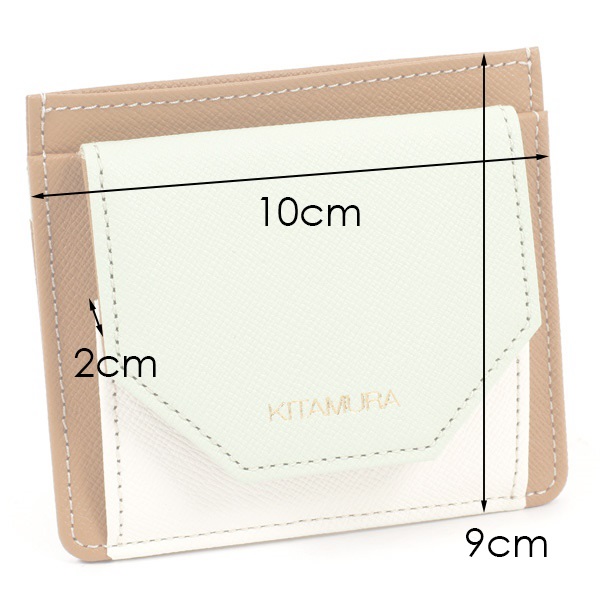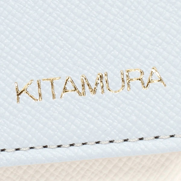 3色のマルチカラーがポイントの小銭入れ。かぶせに箔押しのKITAMURAロゴをあしらいました。お札を半分に畳めば中央のポケットに収納でき、コンパクトなお財布としてもおすすめ。素材にはキズが目立ちにくい型押しの牛革を使用しています。