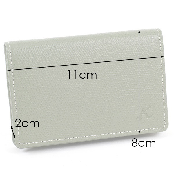 使いやすさが魅力の名刺入れ。キズの目立ちにくい型押し加工を施した牛革素材でお作りしました。かぶせ部分にさりげなくKマークをプラス。シンプルなデザインなので男女兼用でお使いいただけます。