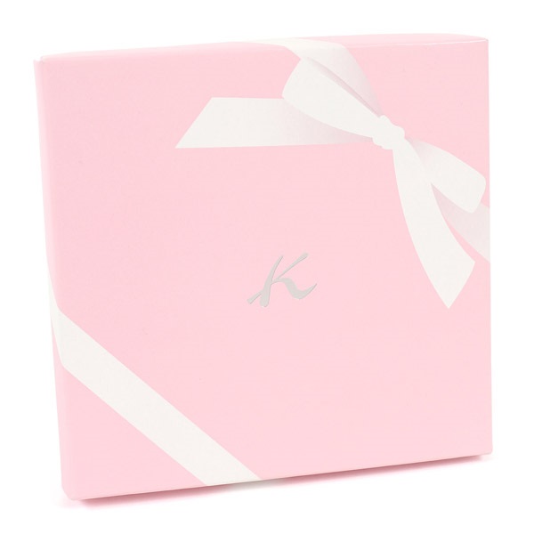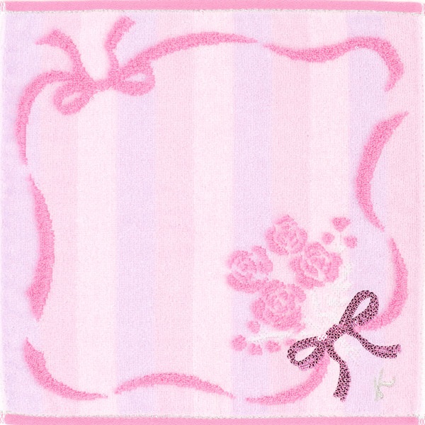 ギフトにおすすめのBOX入りタオルハンカチ。ニュアンスカラーのストライプ柄に、バラの花束とリボンモチーフが華やかで可愛らしいデザインです。花束のリボンにはスパンコールをあしらいました。BOXにはリボン掛けしたようなプリントを施し、特別感をプラス。Kマークのシルバー箔押しがワンポイントになっています。