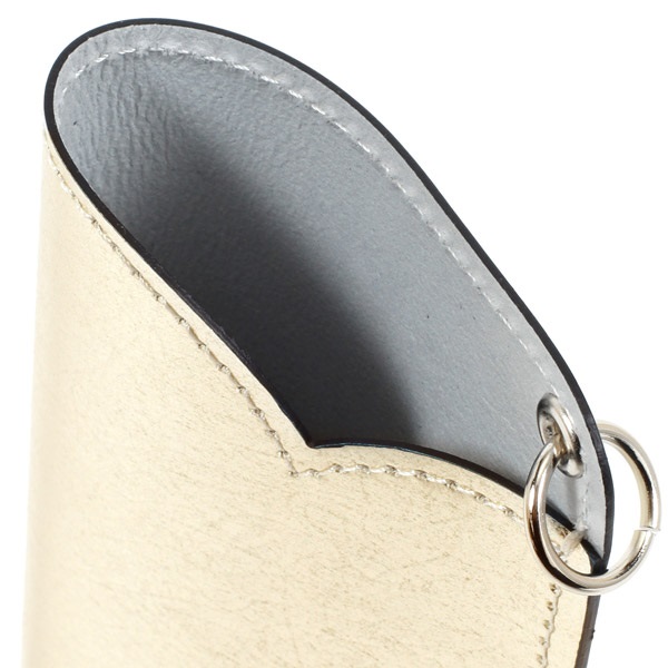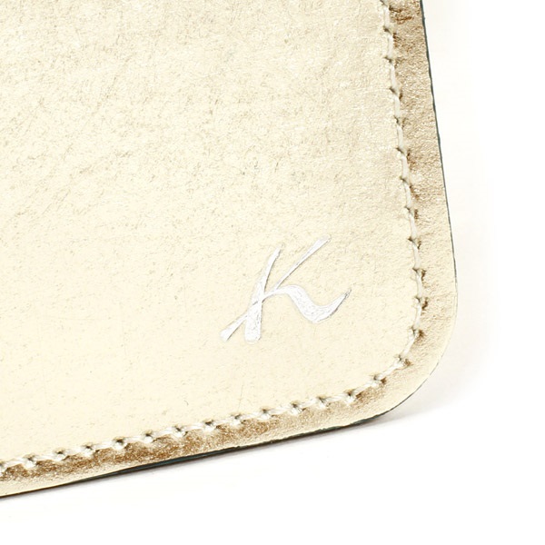 カーブの口元と、キラッと光る箔押しKマークがポイントのメガネケース。本体色によって、素材や仕上げによる質感、箔押しの色が異なります。上部に丸カンが付いており、リールホルダーやネックピースと組み合わせれば、バッグの持ち手や首にぶら下げてお使いいただけます。