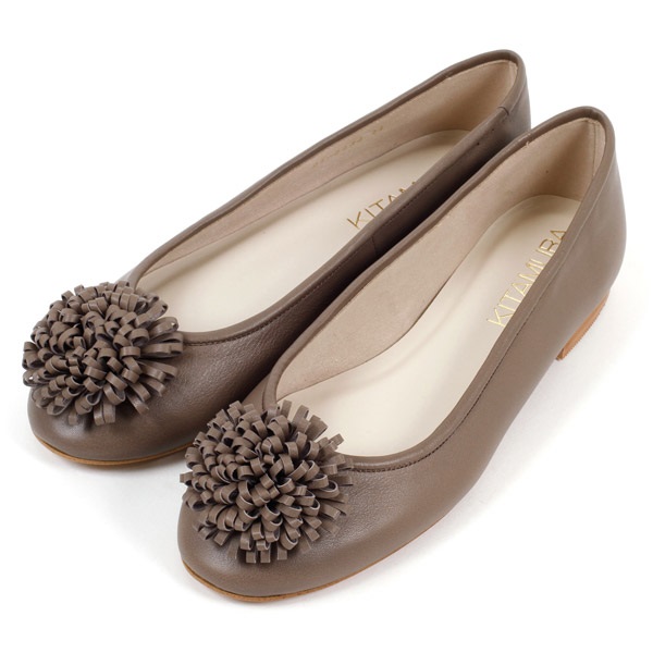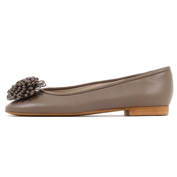 ボリュームのあるフラワーモチーフがポイントのバレエシューズ。モチーフは本体と同素材の革でお作りしています。きれいめからカジュアルまで幅広く合わせやすいベーシックなラウンドトゥに、ローヒールでも脚長効果のある甲浅デザインに仕上げました。定番カラーのダークブルーの他、肌馴染みの良いニュアンスカラーをご用意しています。