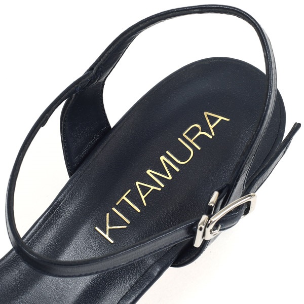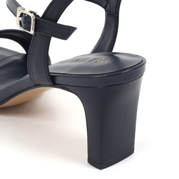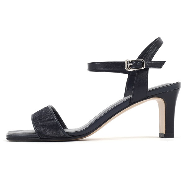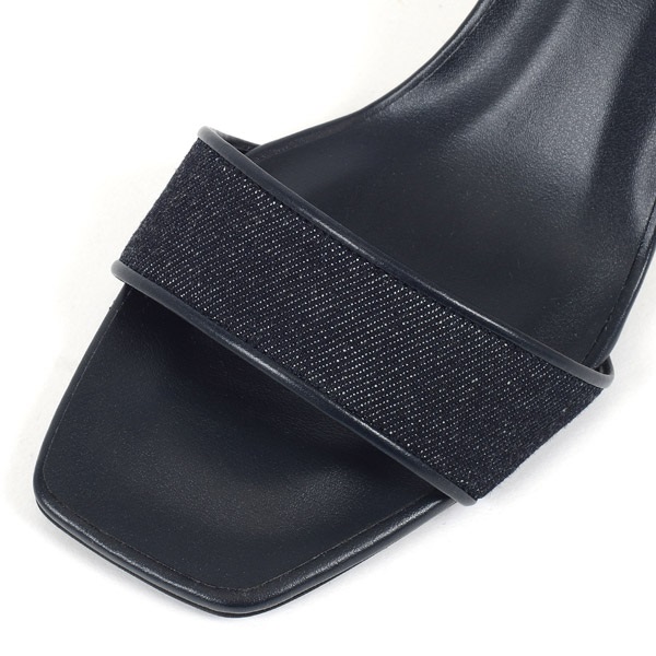 夏のコーディネートで活躍するストラップヒールサンダル。カラーにより素材が異なり、ブラックはグリッター、ダークブルーはデニム素材に牛革のパイピングデザインです。つま先とヒールはトレンド感のあるスクエアフォルムに仕上げました。線の細いシンプルで洗練されたフォルムが、美しい足元を演出します。