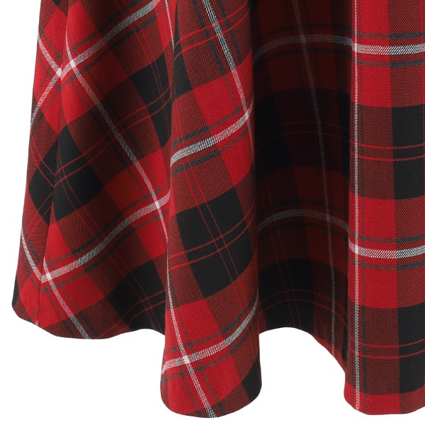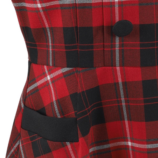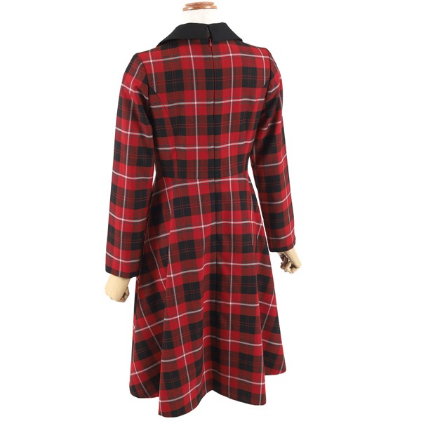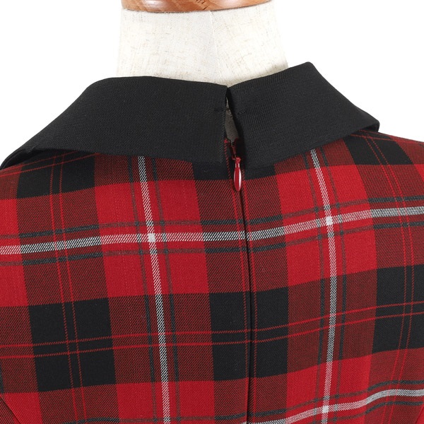 華やかな赤のチェック柄が映える襟付きワンピース。程よいハリ感と柔らかさのあるポリエステルツイル素材を使用しています。ディテールに同系色の別布パーツを盛り込んだ、1枚でサマになるデザインです。首元をすっきり美しく見せてくれるスクエアネックに、あえてシャープな形の襟を組み合わせて甘さを抑えています。また、胸元のダブルボタンデザインでトラッド感をプラスし、きちんと感のある印象に仕上げました。高めのウエスト切り替えでスタイルアップ効果も。スカート部分にはボリュームを持たせ、動いた時の美しいフレアシルエットにもこだわりました。