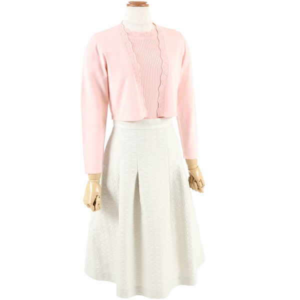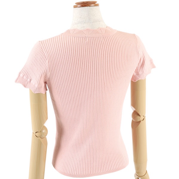 首回りと袖口にあしらったレース風編地がポイントの半袖ニット。リブ編みで伸縮性があり、程よいフィット感で身体のラインを拾いすぎず、すっきりと見せてくれます。Tシャツ感覚で着用できるシンプルなデザインで、きれいめからカジュアルまで、幅広いコーディネートで活躍します。長袖ボレロニット(KH0843)とのアンサンブルもおすすめです。