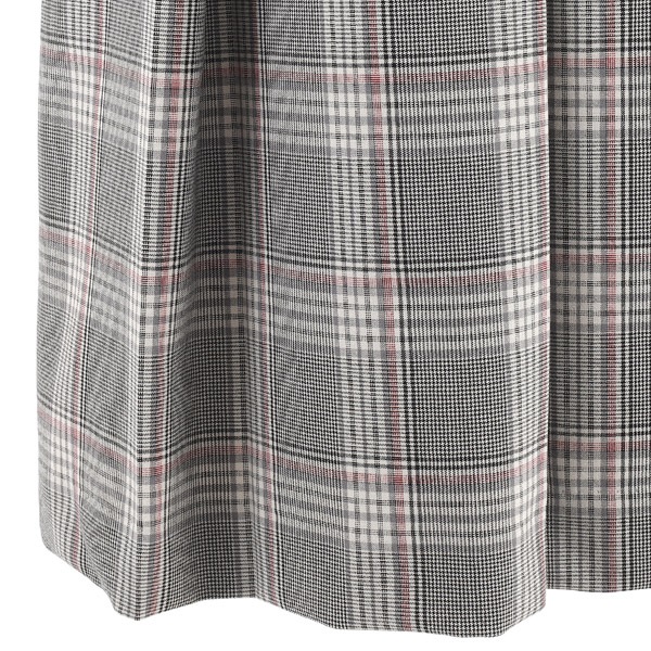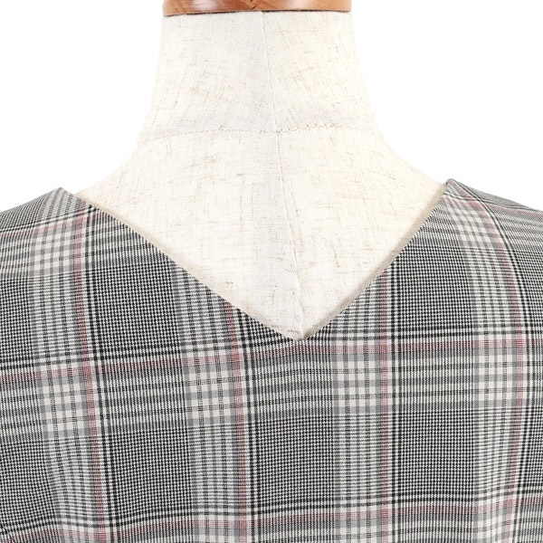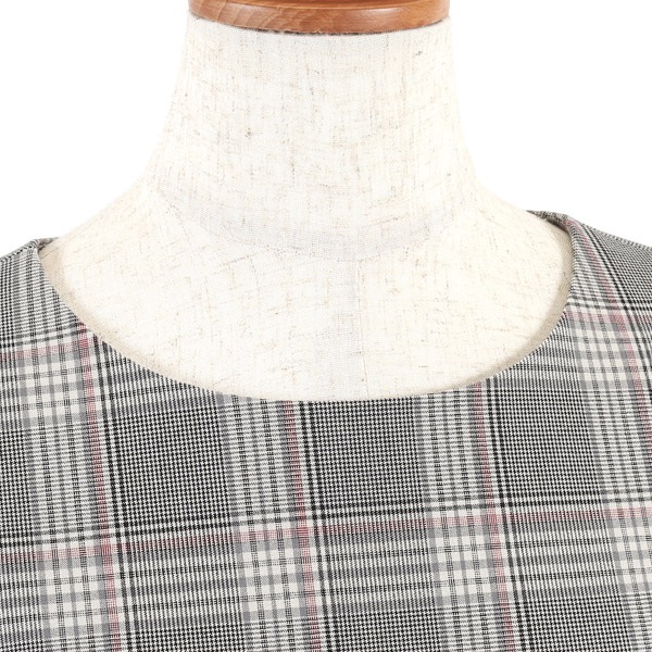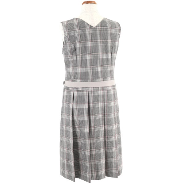 グレンチェック柄のジャンパースカート。プリーツできちんと感をプラスし、トラッドな印象に仕上げました。ウエストベルトの無地の別布がシルエットにメリハリをプラス。Kマークの金具付きボタンがワンポイントです。後ろ側は背中をすっきりと見せてくれるV開きデザインで、バックスタイルにもこだわりました。肌寒い時期にはニットやカーディガンとのレイヤードスタイル、1枚でノースリーブワンピースとしても着用でき、シーズンレスで着回しできるのも嬉しいポイントです。