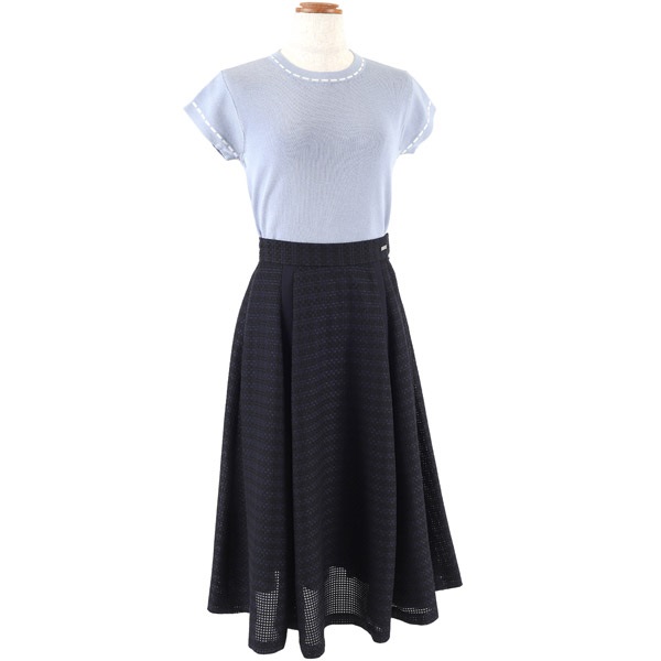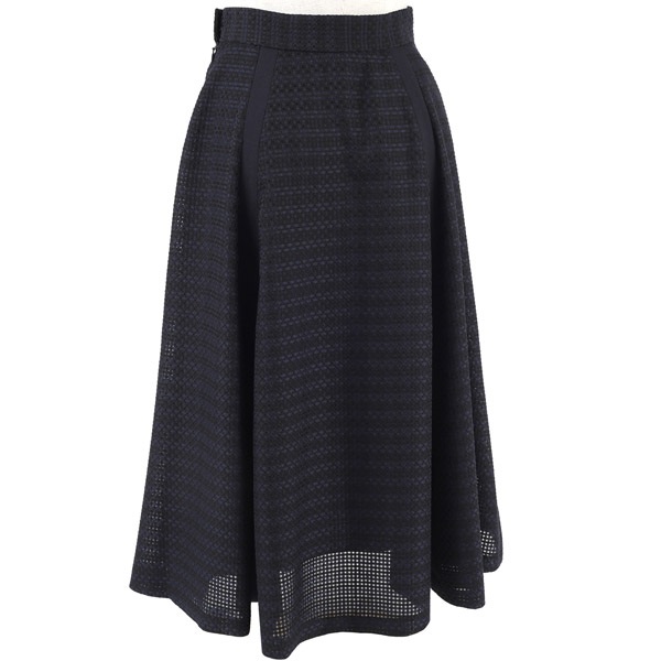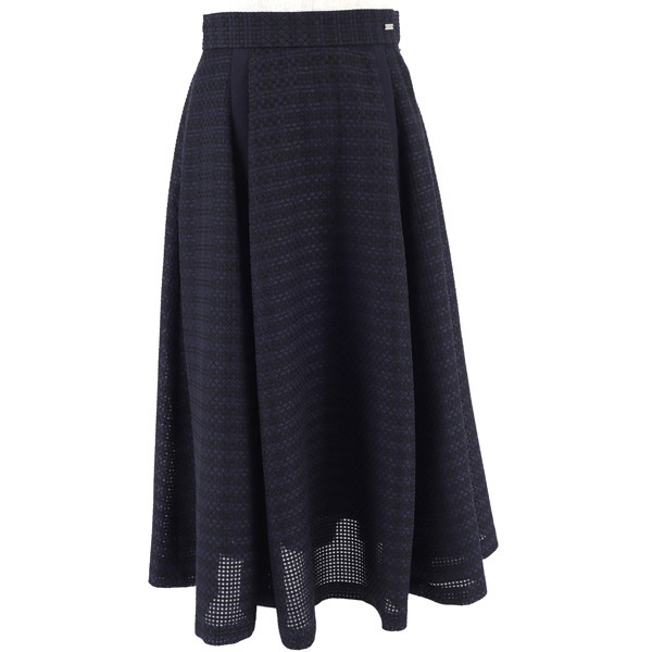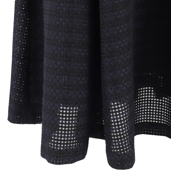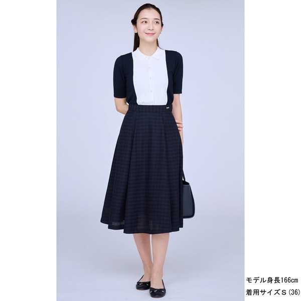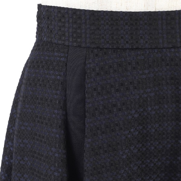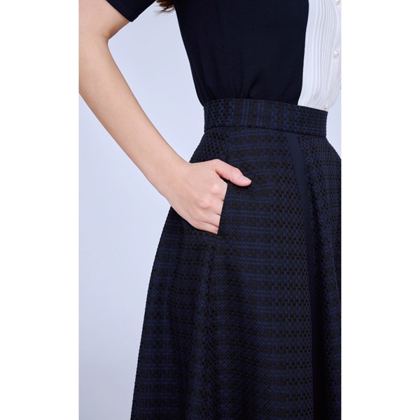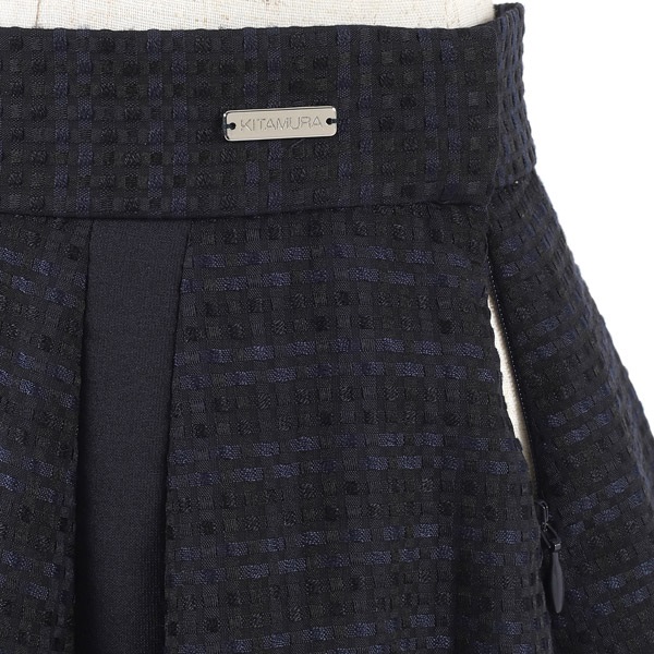 シルエットの美しさにこだわったフレアスカート。チェック柄レース素材をふんだんに使用し、ボリューム感のある華やかな印象に仕上げました。フレア部分にさり気なく入った別布の縦ラインが、動いたときに表情をプラスします。ウエストベルトにはKITAMURAロゴが刻印されたチャームをワンポイントにあしらいました。膝が隠れる上品な丈感で、オンオフ幅広いシーンでお使いいただけます。片側にポケット付きなのも嬉しいポイントです。