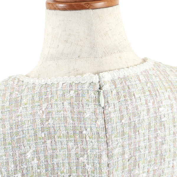 着るだけで華やかさを演出してくれるファンシーツイードの七分丈ワンピース。首元とポケットにあしらったブレードのテープがさり気ないアクセントになっています。首元のカットデザインが抜け感をプラス。袖はボリュームのあるパフスリーブで可愛らしい印象に仕上げました。ややゆったりとしたAラインシルエットですが、スタイルアップして見えるよう、高めのウエスト切り替え位置と、短すぎないミニ丈のバランスにこだわりました。ポケット付きも嬉しいポイント。普段使いはもちろん、オケージョンシーンにもおすすめです。