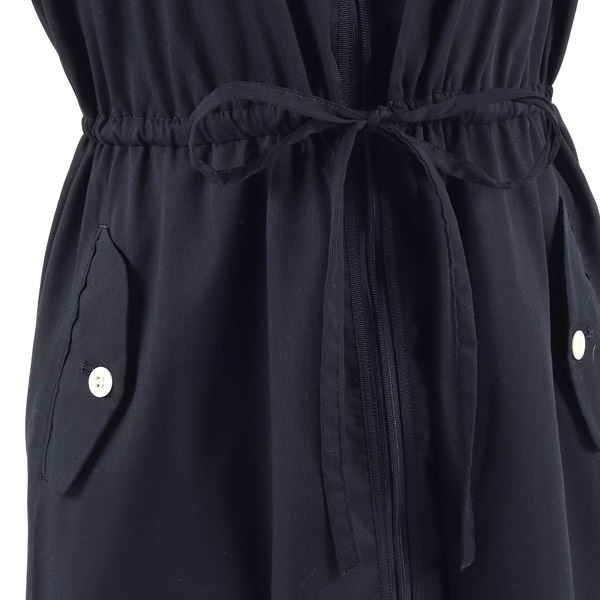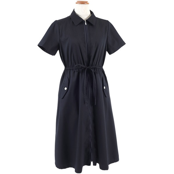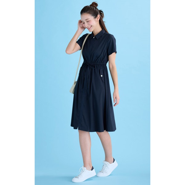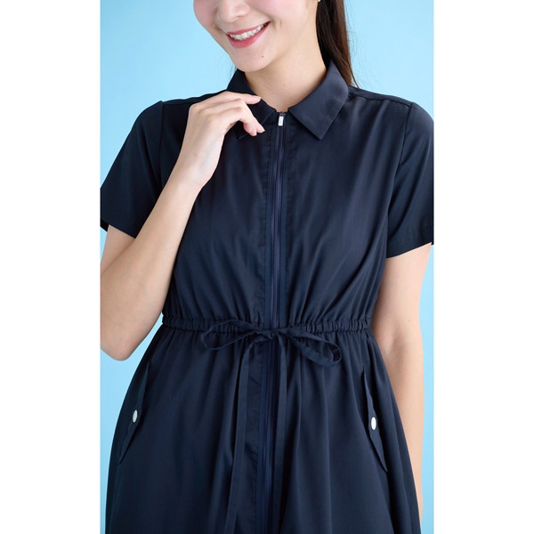 雨の日のお出かけにおすすめの、撥水素材を使用した半袖ワンピース。襟付きデザインにフロントファスナー仕様で、カジュアルな印象に仕上げました。フロントファスナーの両サイドには同色のグログランテープをあしらい、さり気ないアクセントに。また、ファスナーの引手とフラップポケットのボタンにホワイトカラーを使用して、ディテールにもこだわりました。ウエストはギャザーデザインのゴム仕様で自然なブラウジングができ、細めのリボンで絞りを調整も可能。スカートは膝丈の広がりすぎないシルエットで、軽やかに着用していただけます。