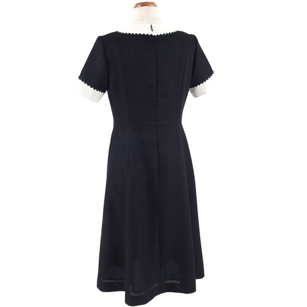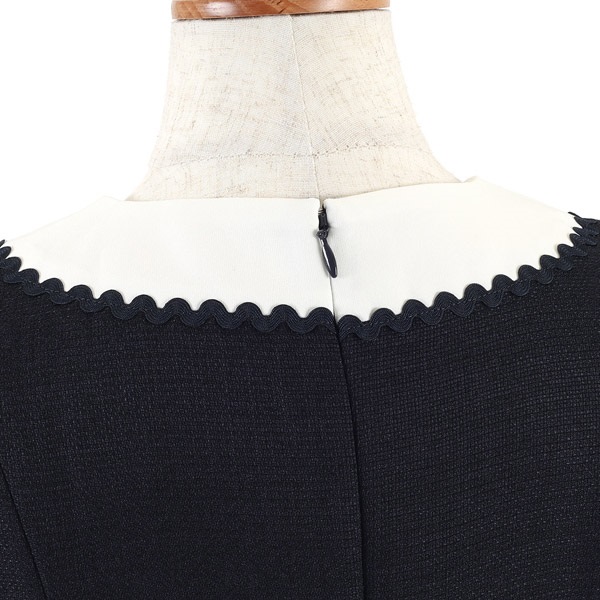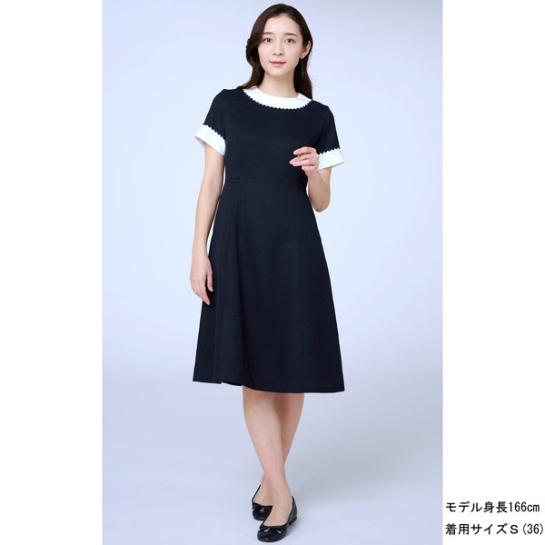 首まわりと袖口の配色デザインがアクセントの半袖ワンピース。リネンライクな素材感がナチュラルで涼しげな印象です。軽量な着心地は汗ばむ季節に嬉しいポイント。配色の切り替え部分には異素材の波型ブレードをあしらい、シンプルながらも細部までこだわったデザインに仕上げました。袖は腕に沿う細めのシルエットで、カーディガンなどの羽織りものもスムーズに着用できます。ウエストから裾にかけてはAラインシルエットで、丈は膝が隠れる上品な丈感。きちんと感のあるシンプルなデザインで、夏のオケージョンシーンにもおすすめです。両サイドにポケット付き。
