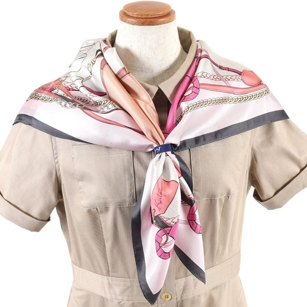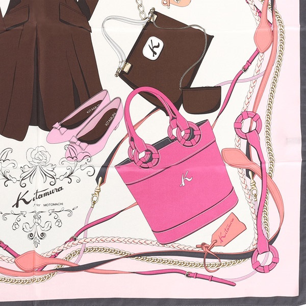 バッグやワンピース、シューズなどキタムラアイテムが大胆にプリントされた大判スカーフ。シルク100%で、上品なツヤが華やか。首や肩に巻くスタイリングはもちろん、バッグの持ち手に巻いたり結んだりするのもおすすめです。