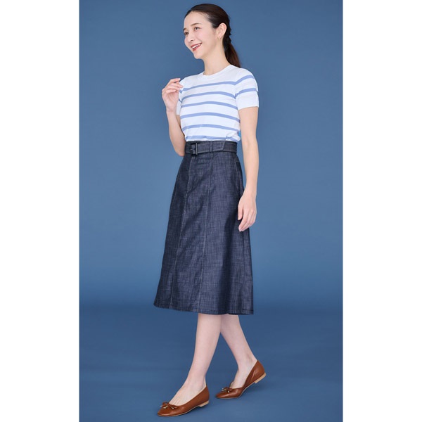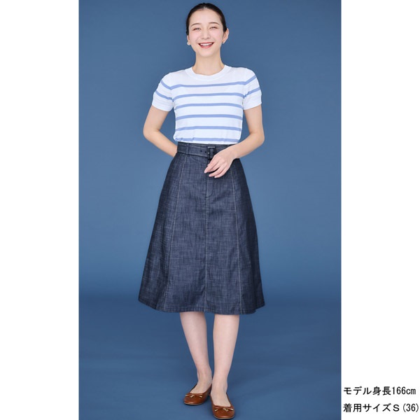 デニム調生地を使用したシンプルなAラインスカート。縦に入った切り替えと配色ステッチで立体感をプラスし、シンプルながら表情のあるデザインに仕上げました。ステッチがAラインシルエットを際立たせ、美しく見せてくれます。ウエストベルトは取り外しでき、お好みでアレンジしていただけます。両サイドにポケットが付いているのも嬉しいポイント。ラフな魅力と上品さを兼ね備えた一枚です。
