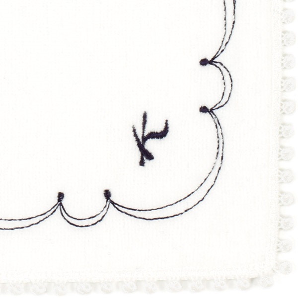 キタムラらしいかわいらしさと上品さを表現したタオルハンカチ。ふちにはレースをあしらい、高級感のある仕上がりです。Kマーク刺繍がワンポイント。ダークブルーとホワイトの落ち着いたカラーコンビでセレモニーシーンにもおすすめです。