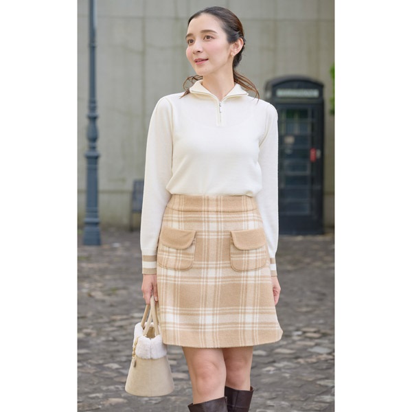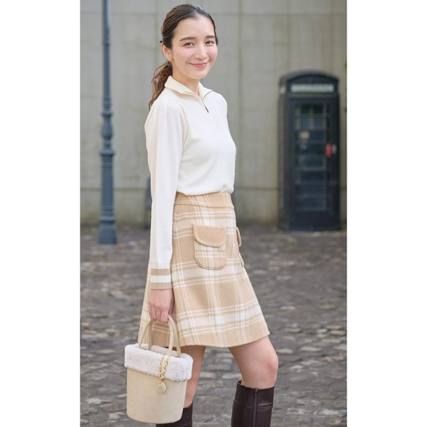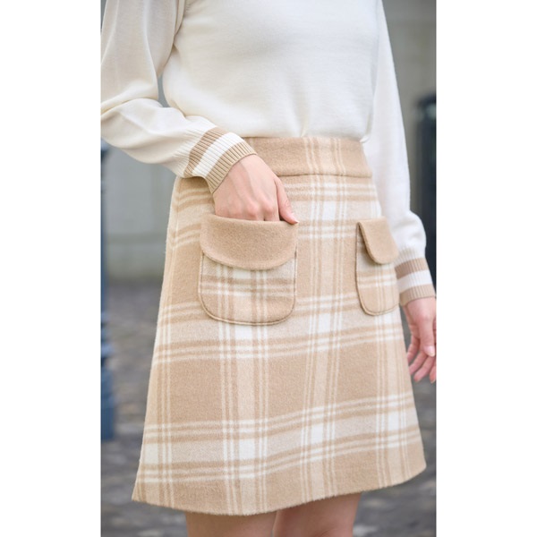 上質なウール素材を使用したスカート。冬らしいロングブーツとのバランスが良いミニ丈で、広がりすぎない台形シルエットに仕上げました。前側にあしらったポケットは、フラップ部分のみ裏側のカラーを見せた、さり気ないカラーコンビがポイント。同素材を使用したジャケット(KH0801)とのセットアップはもちろん、ニット等お持ちのアイテムで幅広いコーディネートがお楽しみいただけます。