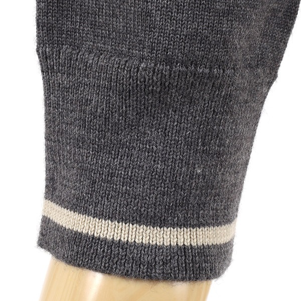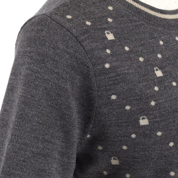 肌触りが非常になめらかで、チクチク感が少ないエクストラファインメリノウールを使用。保温性と吸湿性にも優れ、快適な着心地です。前身頃のバッグ柄は袋ジャガードで表現。プリント生地にはない上品で高級感のある風合いです。