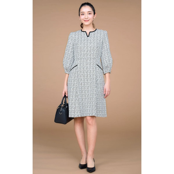 着るだけで華やかさを演出してくれるファンシーツイードの七分丈ワンピース。首元とポケットにあしらったブレードのテープがさり気ないアクセントになっています。首元のカットデザインが抜け感をプラス。袖はボリュームのあるパフスリーブで可愛らしい印象に仕上げました。ややゆったりとしたAラインシルエットですが、スタイルアップして見えるよう、高めのウエスト切り替え位置と、短すぎないミニ丈のバランスにこだわりました。ポケット付きも嬉しいポイント。普段使いはもちろん、オケージョンシーンにもおすすめです。