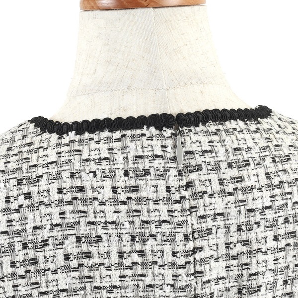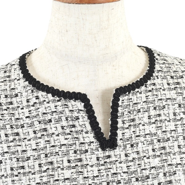 着るだけで華やかさを演出してくれるファンシーツイードの七分丈ワンピース。首元とポケットにあしらったブレードのテープがさり気ないアクセントになっています。首元のカットデザインが抜け感をプラス。袖はボリュームのあるパフスリーブで可愛らしい印象に仕上げました。ややゆったりとしたAラインシルエットですが、スタイルアップして見えるよう、高めのウエスト切り替え位置と、短すぎないミニ丈のバランスにこだわりました。ポケット付きも嬉しいポイント。普段使いはもちろん、オケージョンシーンにもおすすめです。