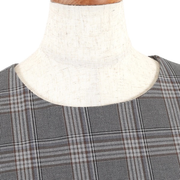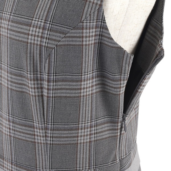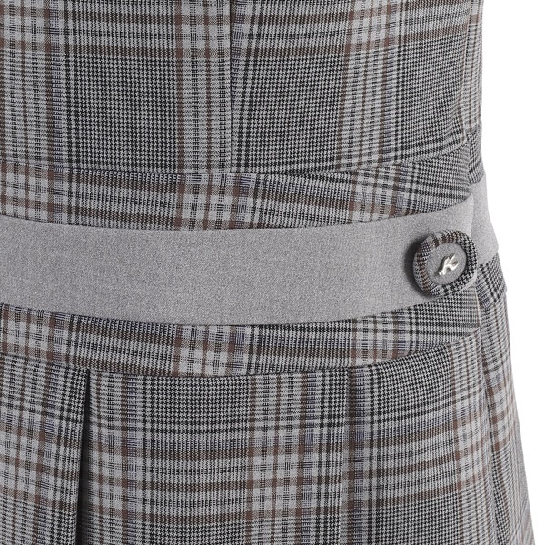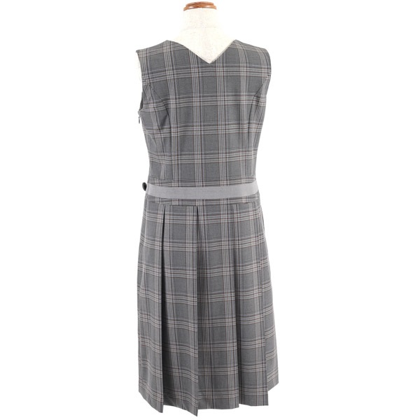 グレンチェック柄のジャンパースカート。プリーツできちんと感をプラスし、トラッドな印象に仕上げました。ウエストベルトの無地の別布がシルエットにメリハリをプラス。Kマークの金具付きボタンがワンポイントです。後ろ側は背中をすっきりと見せてくれるV開きデザインで、バックスタイルにもこだわりました。肌寒い時期にはニットやカーディガンとのレイヤードスタイル、1枚でノースリーブワンピースとしても着用でき、シーズンレスで着回しできるのも嬉しいポイントです。